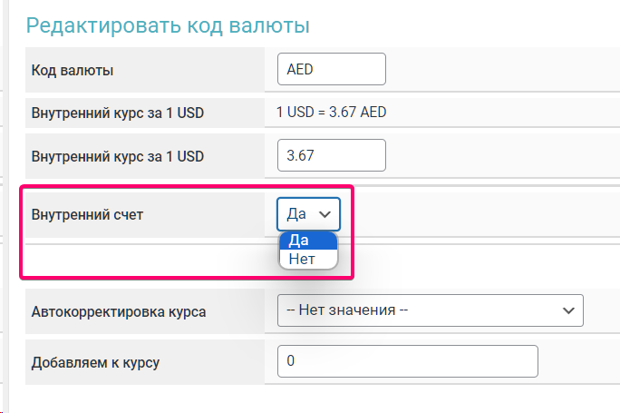 Валюты, отображаемые в блоке и доступные к использованию как внутренние, выбираются в разделе "**Валюты**" -> "**Коды валют**", опция "**Внутренний счёт**".
