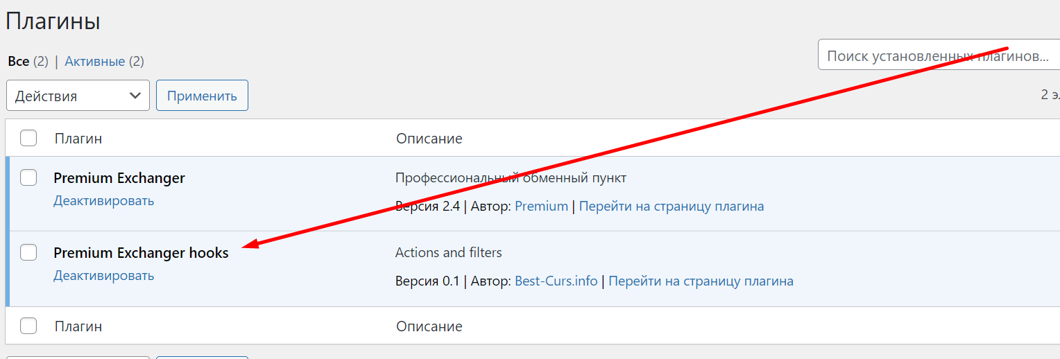 Затем в разделе "**Плагины**" активируйте плагин "**Premium Exchanger hooks**".
